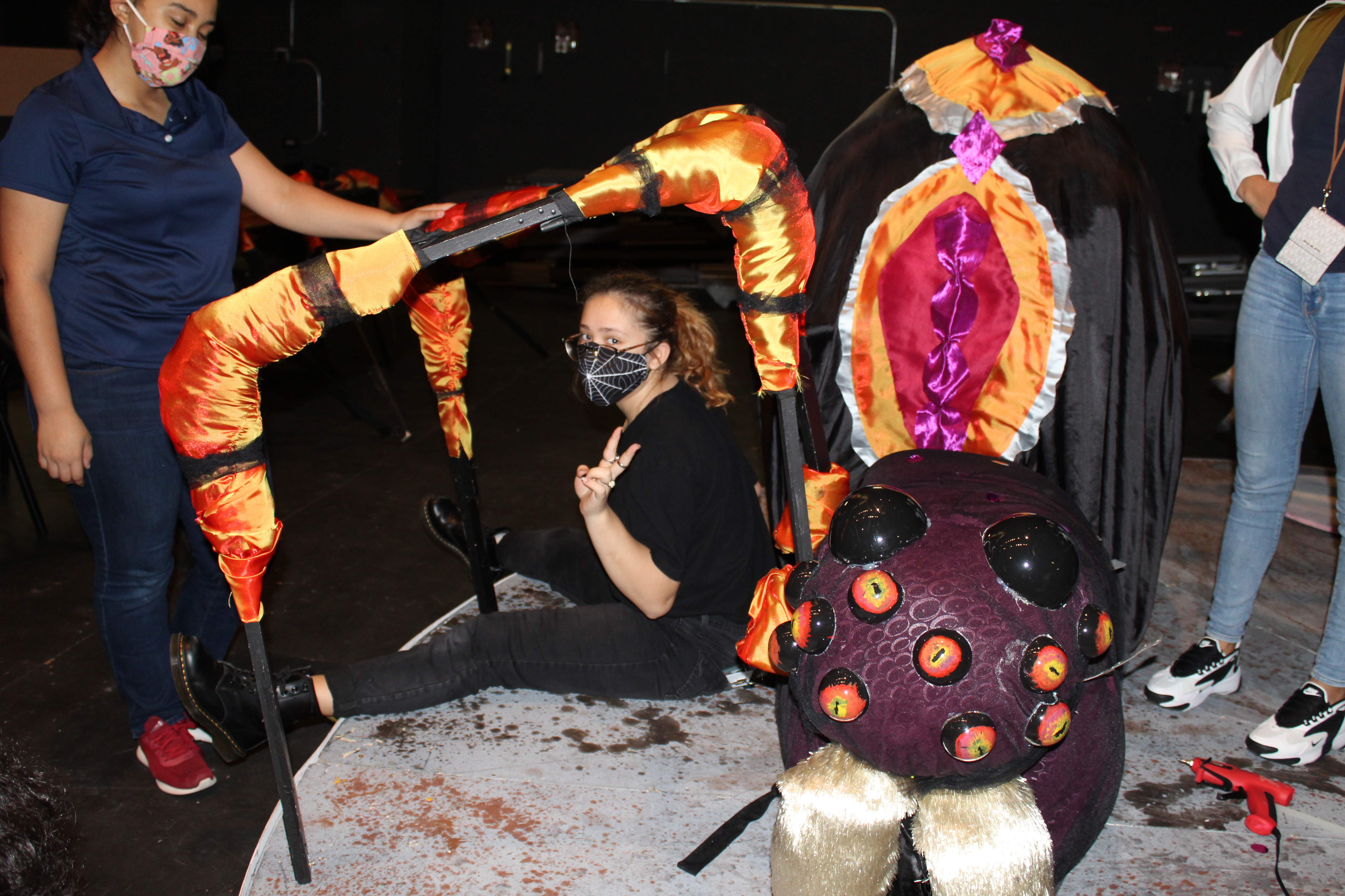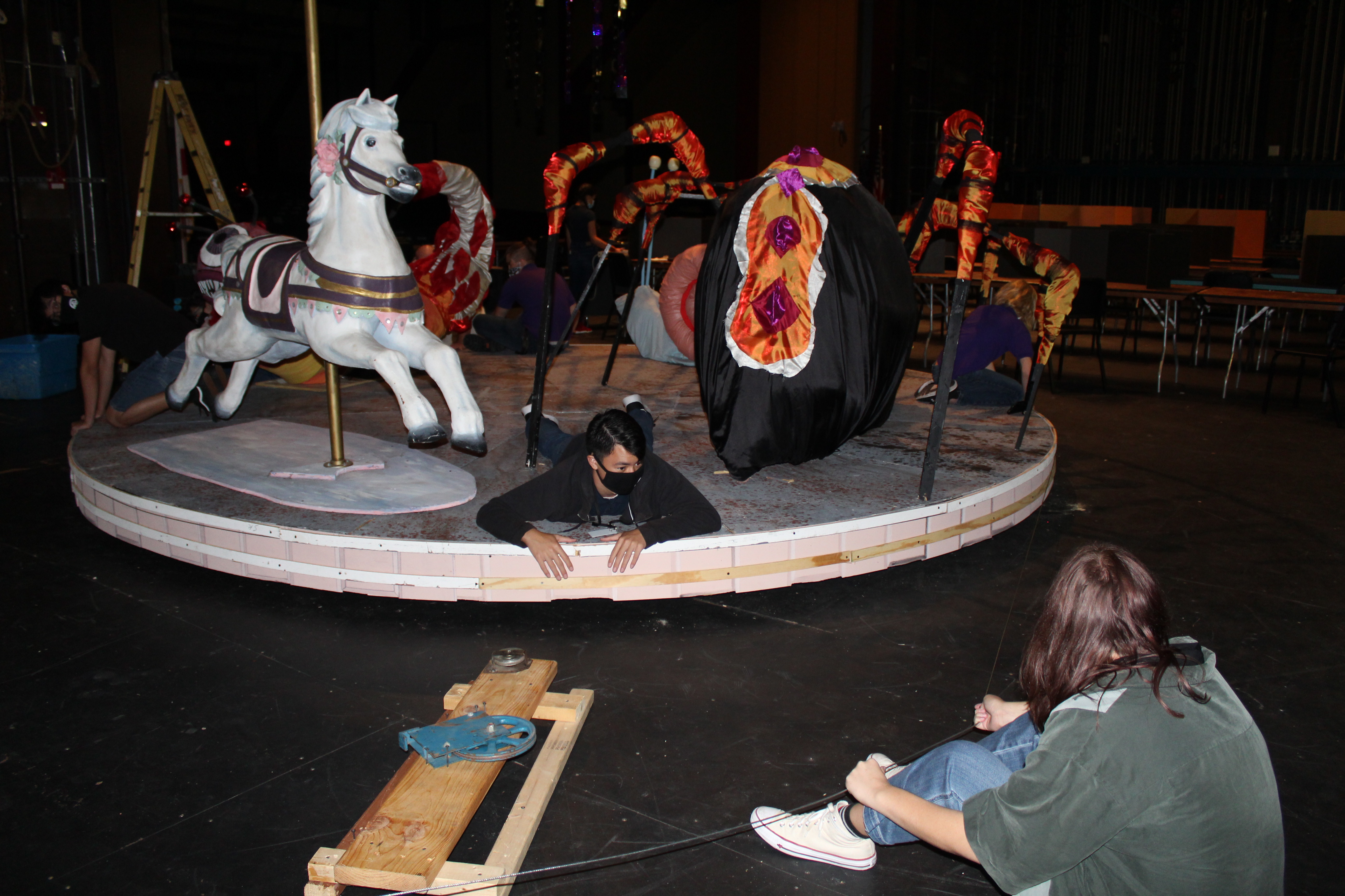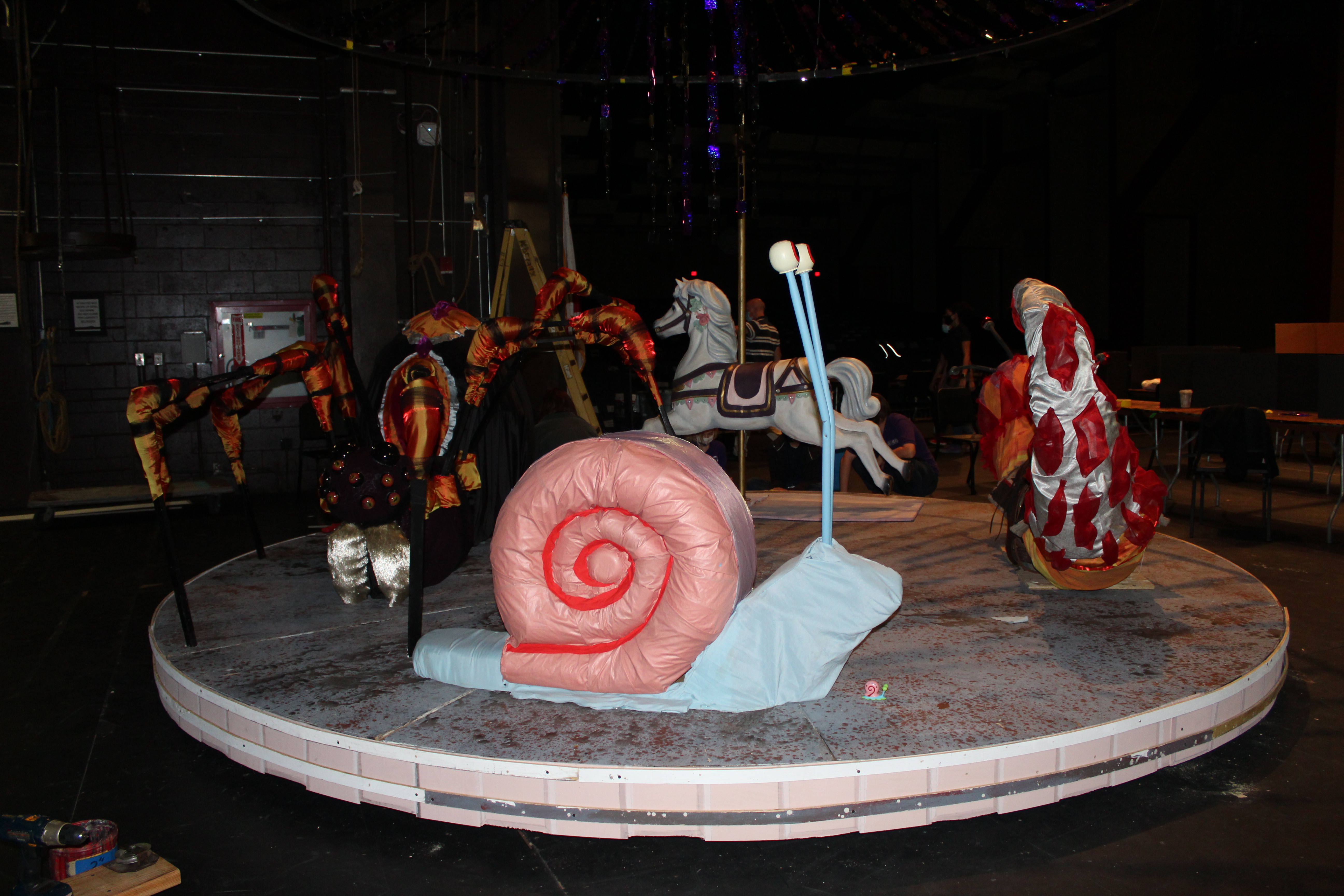 I still had a shop full of tech students and no shows to build....soo.... we decided to build a carosel and have students take rides during lunch. We already had a horse in the prop room. I insisted on a spider because I had never seen a spider on a carosel before. The students insisted on Gary the snail from sponge bob, and we pieced together a eyeball worm from leftover monster parts.