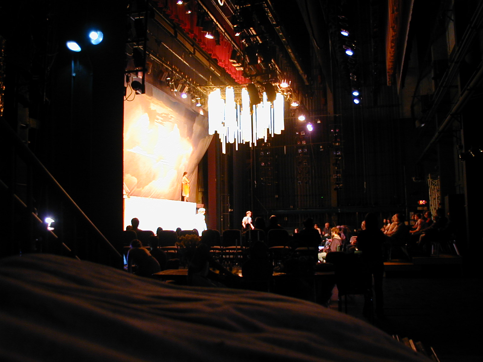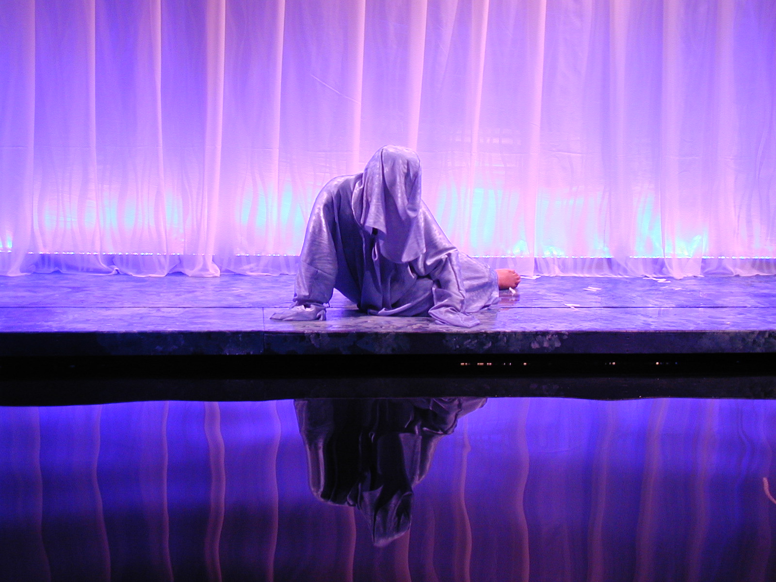 | This was an interesting show to produce. The show calls for a pool of water filling the stage. We chose to reverse the playing space and put the audience on stage with the set. This is the benefit of having a conventions center size stage to work with. | |