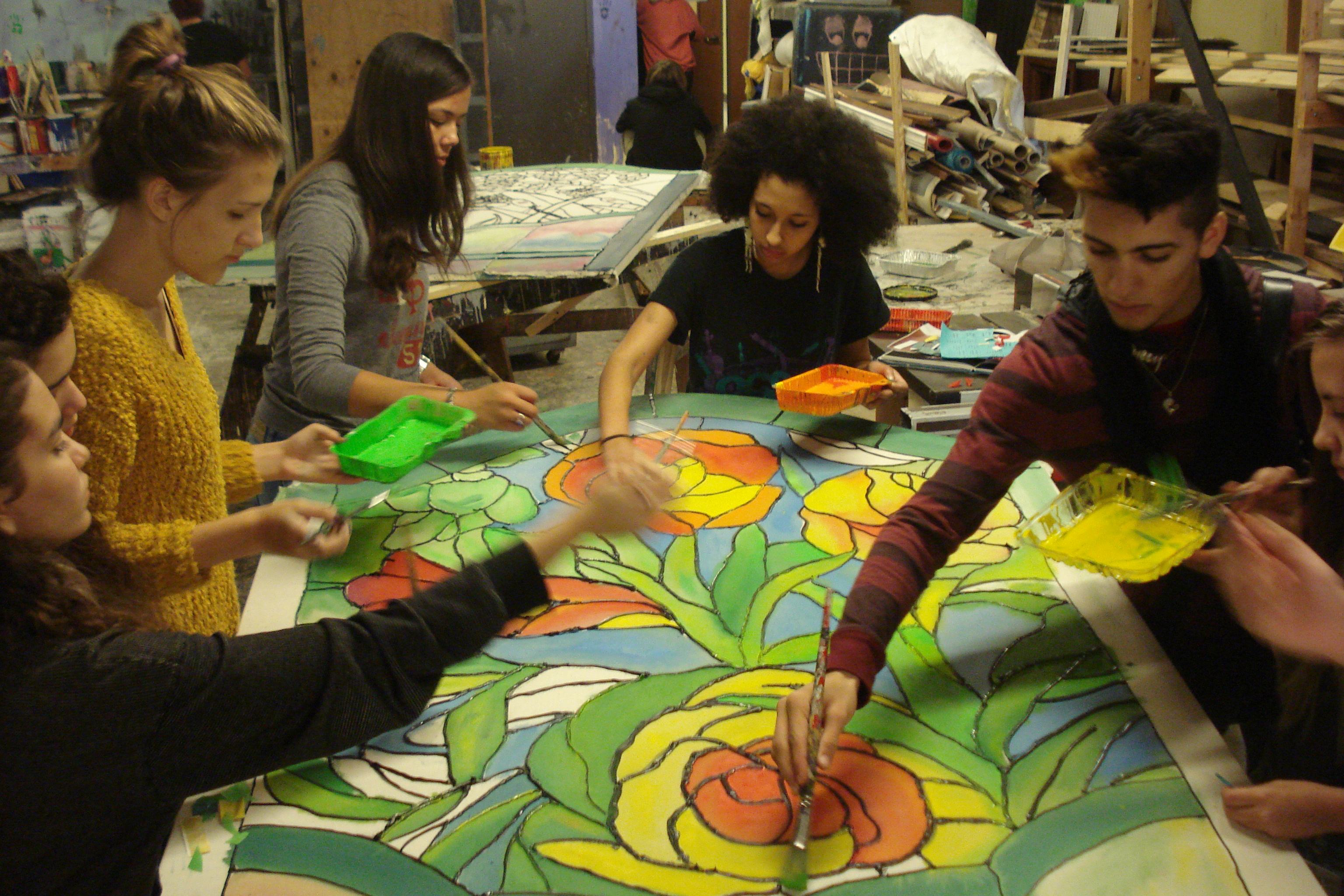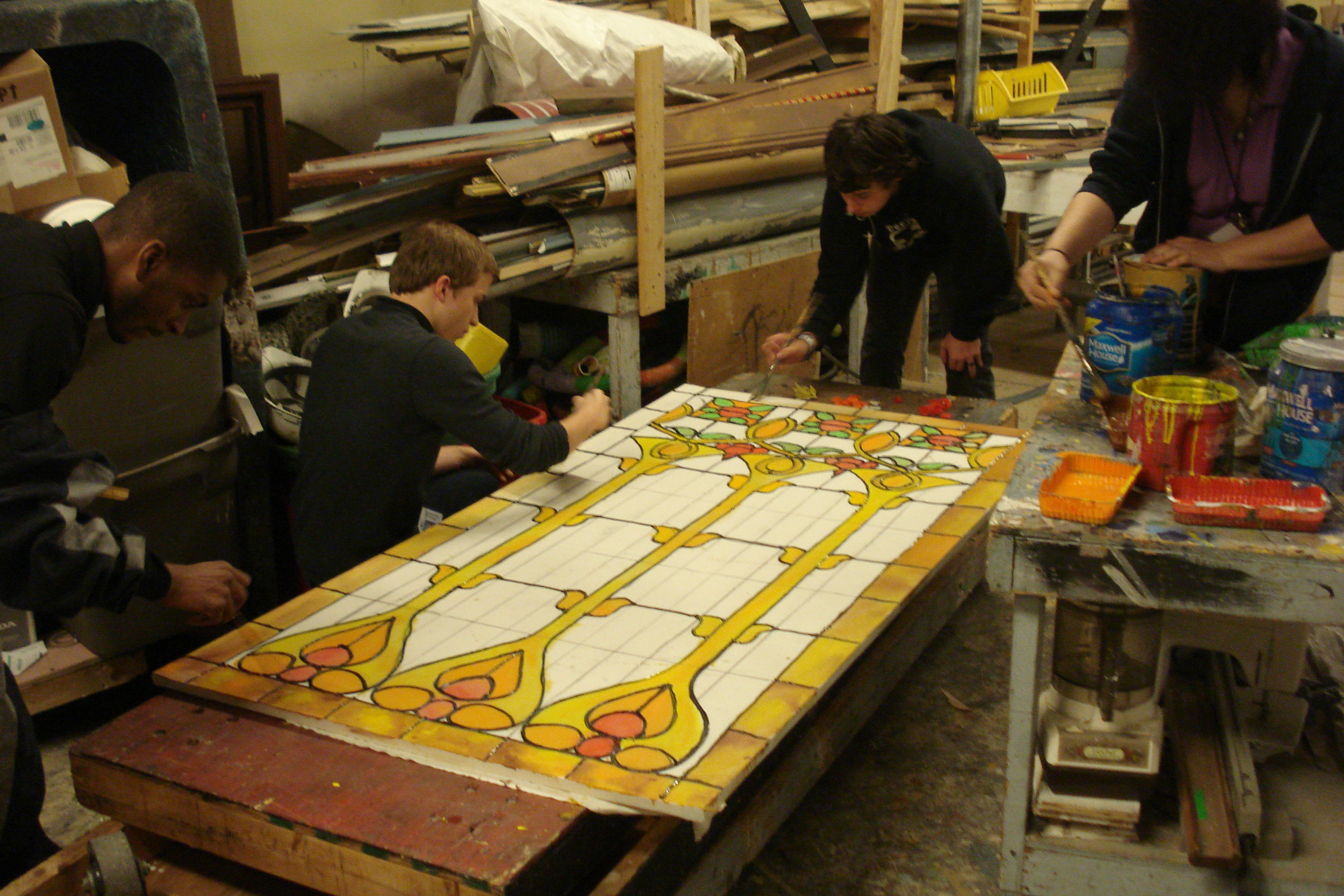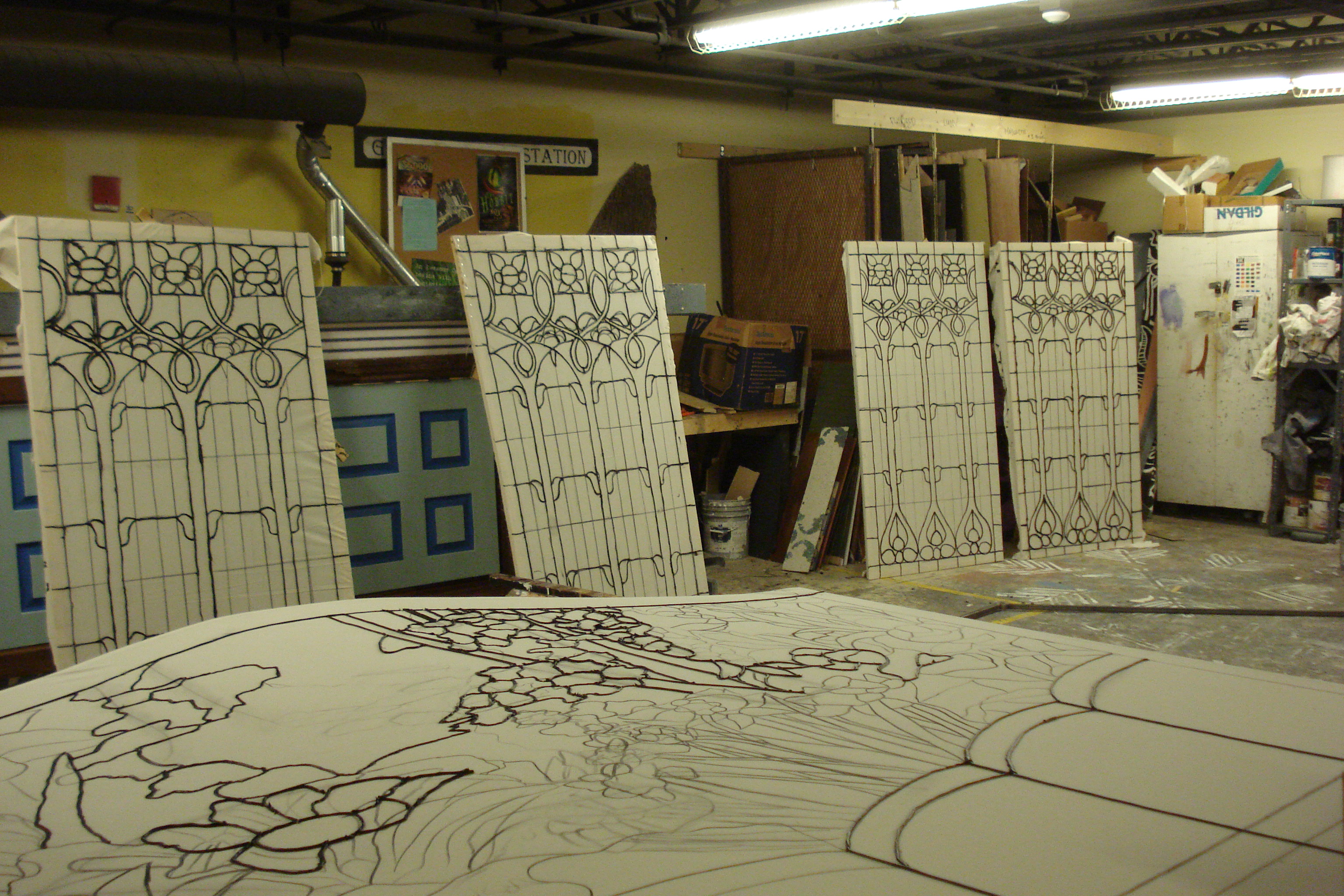 The concept for the set was a stained glass window. But for our 50' proscenium that turned into a huge amount of steel frames covered with muslin and painted with translucent paint. |